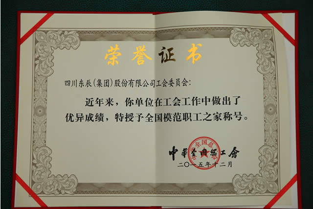 2016年6月15日,東辰集團(tuán)工會(huì)獲“全國(guó)模范職工之家”榮譽(yù)稱號(hào)授牌儀式在公司舉行,受全國(guó)總工會(huì)委托,綿陽(yáng)市總工會(huì)黨組書(shū)記、常務(wù)副主席彭時(shí)榮向公司工會(huì)授牌,涪城區(qū)委常委、區(qū)總工會(huì)主席趙越,區(qū)總工會(huì)黨組書(shū)記、常務(wù)副主席陳竹等領(lǐng)導(dǎo)出席了儀式,東辰集團(tuán)總經(jīng)理趙賢政主持了儀式。