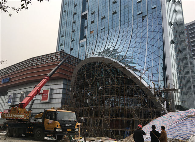 14#酒店:入口鋼構(gòu)雨篷玻璃面板安裝