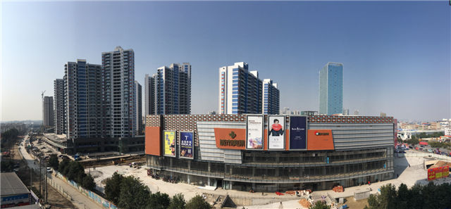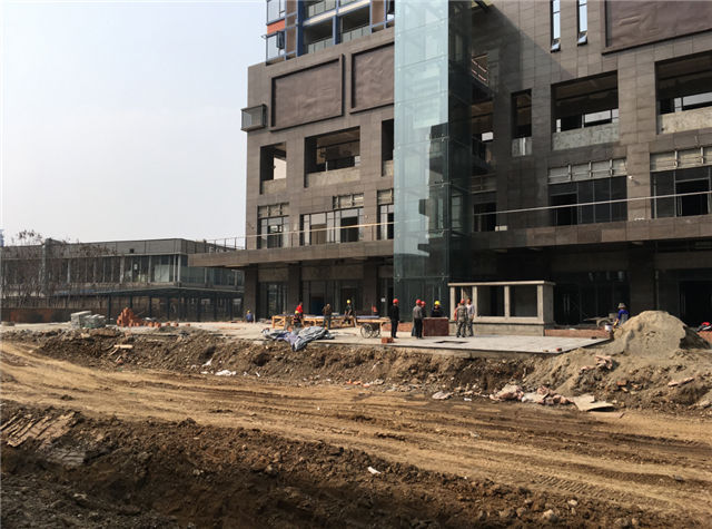 7、室外附屬:居然之家主入口室外附屬全部完成;時尚百貨及弘光路一側(cè)廣場大面積石材鋪貼完成,8#、9#樓一側(cè)室外鋪裝區(qū)域正在做石材面層粘貼。居然之家四層屋面鋪裝及綠化施工完畢。A、B區(qū)中間市政道路正在進行開挖、埋管施工中。