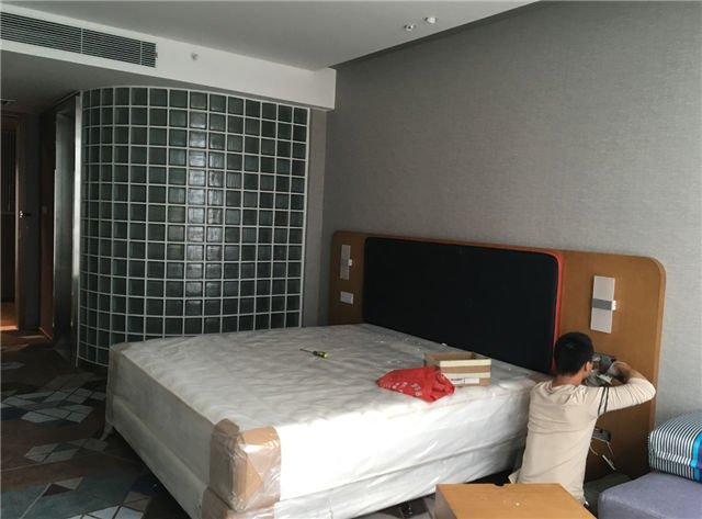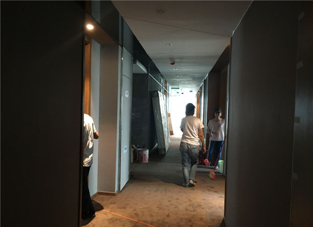 3、酒店:各樓層客房內(nèi)天棚、墻紙、木門、隔斷、衣柜,鏡面、地毯、衛(wèi)生潔具、洗浴配件、床、家具已全部安裝完成,正在進(jìn)行清理打掃。外立面幕墻、主入口雨篷施工完成。